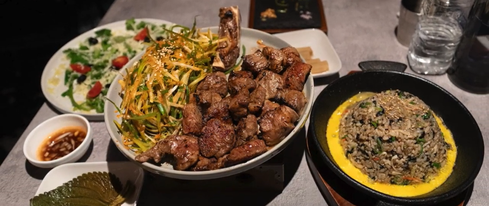 Includes 2 servings skirt steak, 1 serving lemon kalbi, spicy pollock roe stone rice, wagyu fried rice, and soy-marinated blue crab.